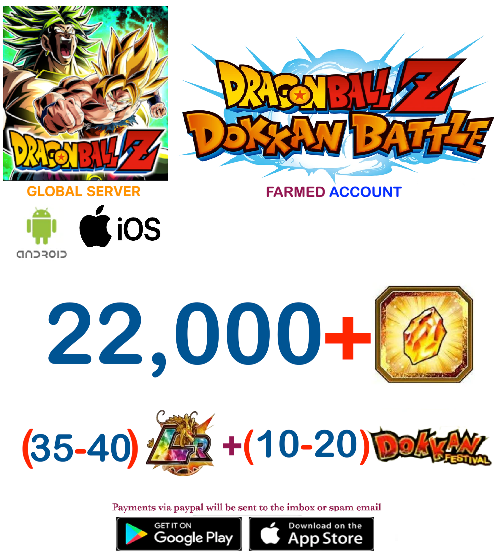 (Global Server)(ANDROID/IOS VERSION) 22,000 + Dragon Stones Dragon Ball Dokkan Battle Farmed Account