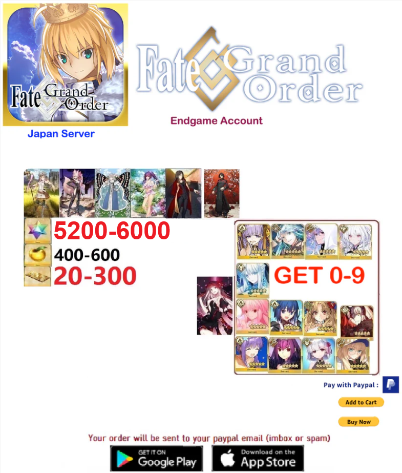 [JAPAN SERVER// CELL PHONE ONLY - NO EMULATOR!] Get 0-9 ssr Random(not counting the supports)- 5200-6000 SQ Fate Grand Order FGO Endgame Reroll Account(includes 5$ of paid sq)