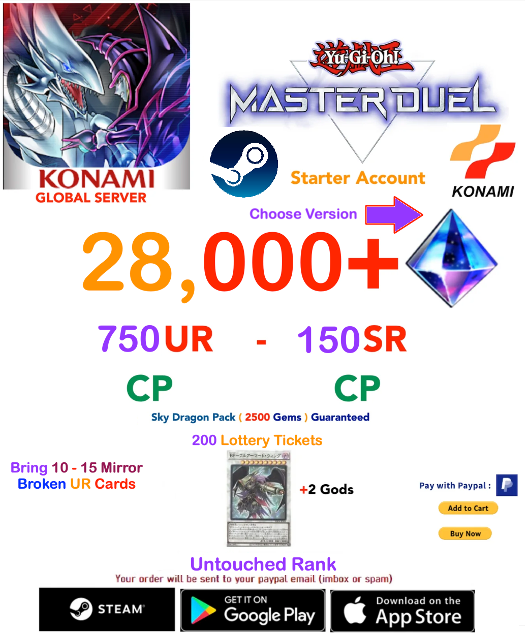 [SERVER GLOBAL/KONAMI-STEAM VERSION] 28,000- 35,000+ Gems 750UR-150SR CP Yu-Gi-Oh! Master Duel Starter Reroll Account